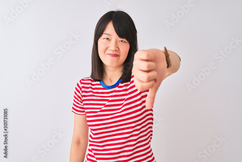 Young beautiful chinese woman wearing red striped t-shirt over isolated white background looking unhappy and angry showing rejection and negative with thumbs down gesture. Bad expression.