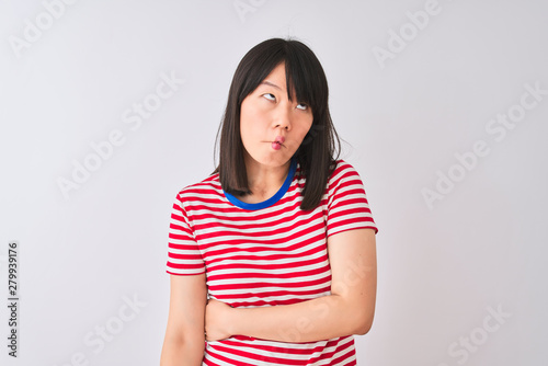 Young beautiful chinese woman wearing red striped t-shirt over isolated white background making fish face with lips, crazy and comical gesture. Funny expression.