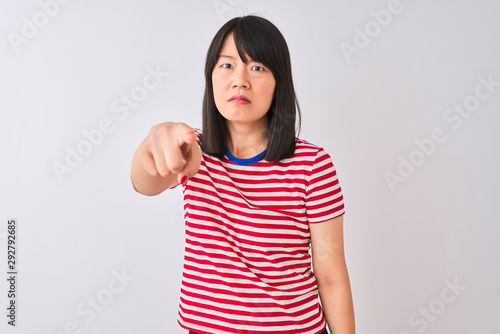 Young beautiful chinese woman wearing red striped t-shirt over isolated white background pointing displeased and frustrated to the camera, angry and furious with you