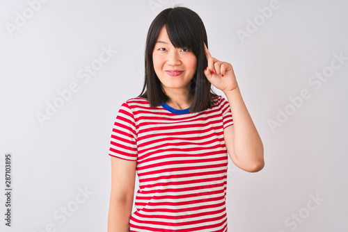 Young beautiful chinese woman wearing red striped t-shirt over isolated white background Smiling pointing to head with one finger, great idea or thought, good memory