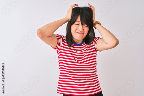 Young beautiful chinese woman wearing red striped t-shirt over isolated white background suffering from headache desperate and stressed because pain and migraine. Hands on head.