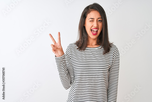 Young beautiful chinese woman wearing striped t-shirt standing over isolated white background smiling with happy face winking at the camera doing victory sign. Number two.