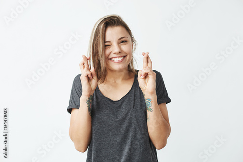 Young beautiful emotive girl smiling winking looking at camera praying over white background.