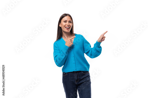 young beautiful european brunette woman dressed in a blue cardigan gesturing with her hands pointing space for advertising
