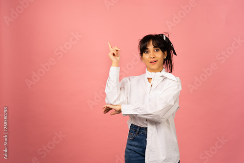 Young beautiful girl in a white shirt posing for a photo on a pink background.