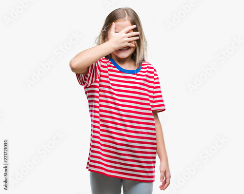 Young beautiful girl over isolated background smiling and laughing with hand on face covering eyes for surprise. Blind concept.