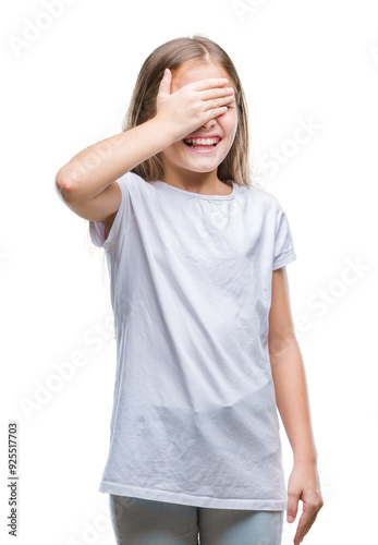 Young beautiful girl over isolated background smiling and laughing with hand on face covering eyes for surprise. Blind concept.