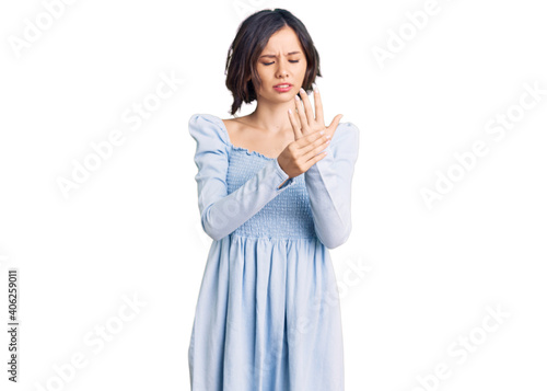 Young beautiful girl wearing casual clothes suffering pain on hands and fingers, arthritis inflammation