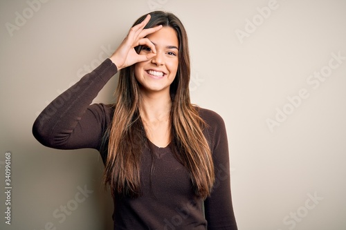 Young beautiful girl wearing casual sweater standing over isolated white background doing ok gesture with hand smiling, eye looking through fingers with happy face.
