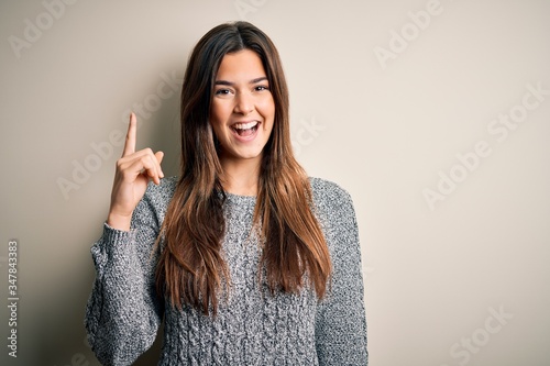 Young beautiful girl wearing casual sweater standing over isolated white background pointing finger up with successful idea. Exited and happy. Number one.