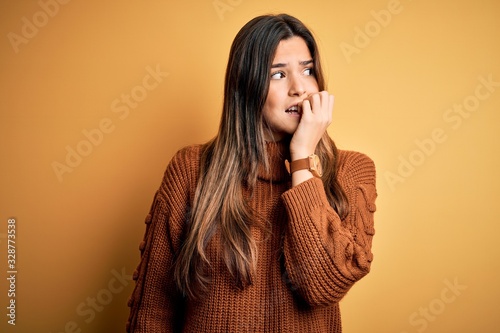 Young beautiful girl wearing casual sweater standing over isolated yellow background looking stressed and nervous with hands on mouth biting nails. Anxiety problem.
