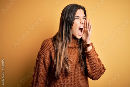Young beautiful girl wearing casual sweater standing over isolated yellow background shouting and screaming loud to side with hand on mouth. Communication concept.