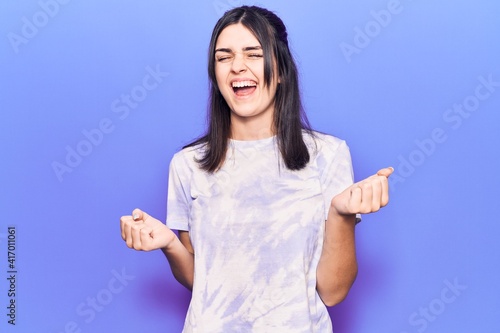 Young beautiful girl wearing casual t shirt celebrating surprised and amazed for success with arms raised and eyes closed
