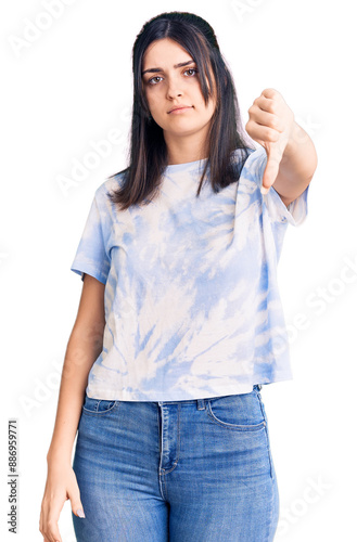 Young beautiful girl wearing casual t shirt looking unhappy and angry showing rejection and negative with thumbs down gesture. bad expression.
