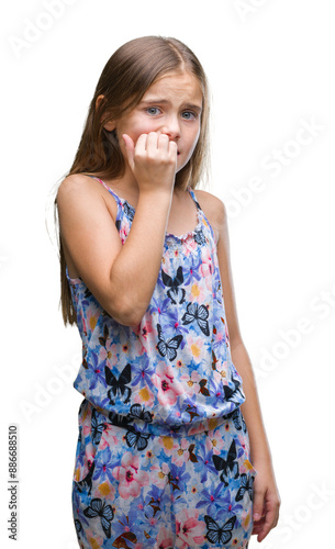 Young beautiful girl wearing colorful dress over isolated background looking stressed and nervous with hands on mouth biting nails. Anxiety problem.