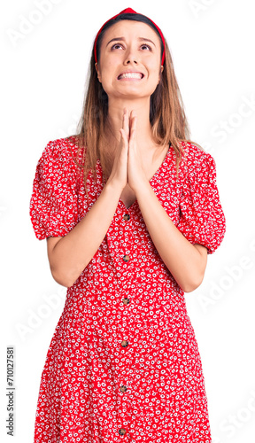 Young beautiful girl wearing dress and diadem begging and praying with hands together with hope expression on face very emotional and worried. begging.