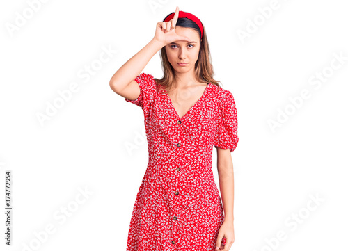 Young beautiful girl wearing dress and diadem making fun of people with fingers on forehead doing loser gesture mocking and insulting.