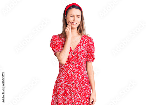 Young beautiful girl wearing dress and diadem touching mouth with hand with painful expression because of toothache or dental illness on teeth. dentist