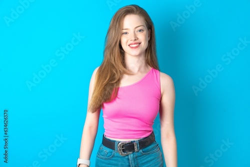 Young beautiful girl wearing pink T-shirt with nice beaming smile pleased expression. Positive emotions concept