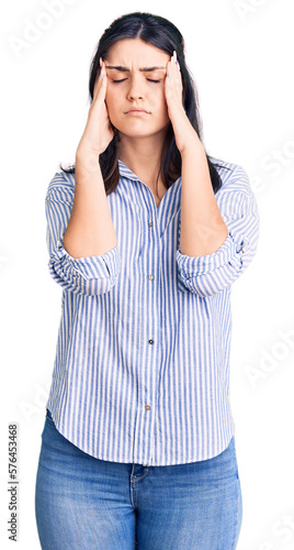 Young beautiful girl wearing striped shirt suffering from headache desperate and stressed because pain and migraine. hands on head.