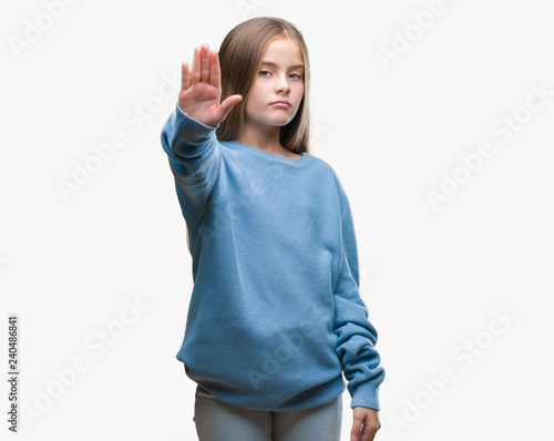 Young beautiful girl wearing winter sweater over isolated background doing stop sing with palm of the hand. Warning expression with negative and serious gesture on the face.