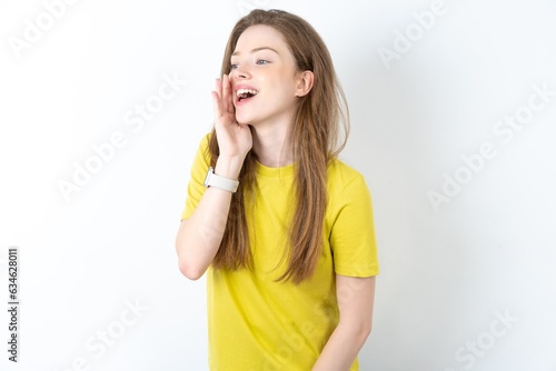 Young beautiful girl wearing yellow T-shirt look empty space holding hand face and screaming or calling someone.