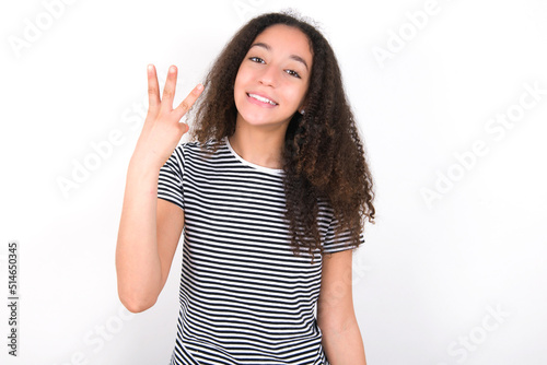 young beautiful girl with afro hairstyle wearing striped t-shirt over white wall smiling and looking friendly, showing number three or third with hand forward, counting down