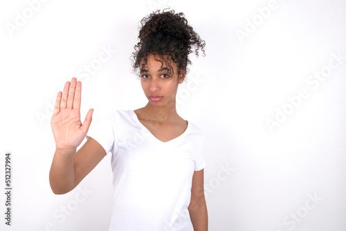 Young beautiful girl with afro hairstyle wearing white t-shirt over white wall shows stop sign prohibition symbol keeps palm forward to camera with strict expression