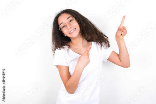 young beautiful girl with afro hairstyle wearing white t-shirt over white wall with positive expression, indicates with fore finger at blank copy space for your promotional text or advertisement.
