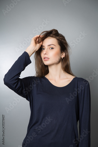 young beautiful girl with long brown hair. She raised her hand to her hair. Dark blue sweatshirt. Grey background