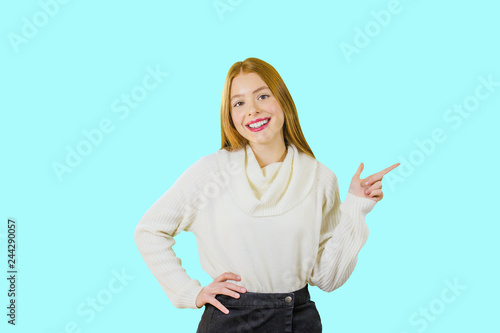 Young beautiful girl with red hair with her head bent to the side with her index finger pointing to the side and smiling at the camera on an isolated background