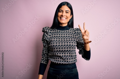 Young beautiful hispanic business woman wearing elegant sweater over pink background smiling with happy face winking at the camera doing victory sign. Number two.