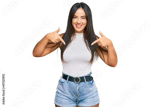 Young beautiful hispanic girl wearing casual clothes looking confident with smile on face, pointing oneself with fingers proud and happy.