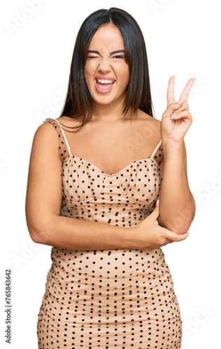 Young beautiful hispanic girl wearing sexy party dress smiling with happy face winking at the camera doing victory sign. number two.