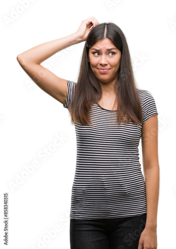Young beautiful hispanic woman confuse and wonder about question. Uncertain with doubt, thinking with hand on head. Pensive concept.