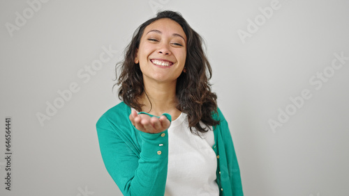 Young beautiful hispanic woman smiling confident blowing kiss over isolated white background