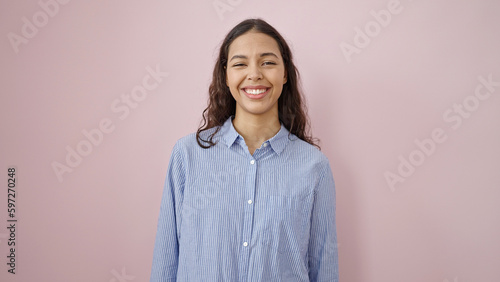 Young beautiful hispanic woman smiling confident over isolated pink background