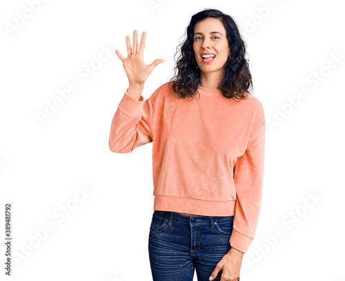Young beautiful hispanic woman wearing casual clothes showing and pointing up with fingers number five while smiling confident and happy.