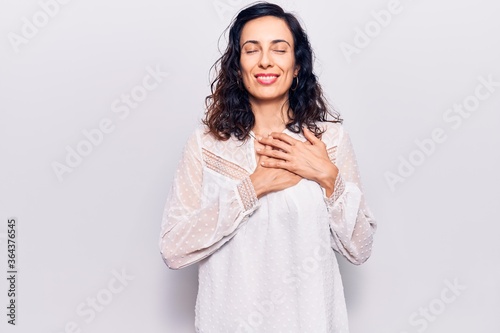 Young beautiful hispanic woman wearing casual clothes smiling with hands on chest with closed eyes and grateful gesture on face. health concept.