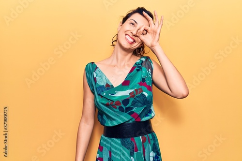 Young beautiful hispanic woman wearing casual dress smiling happy doing ok sign with hand on eye looking through fingers