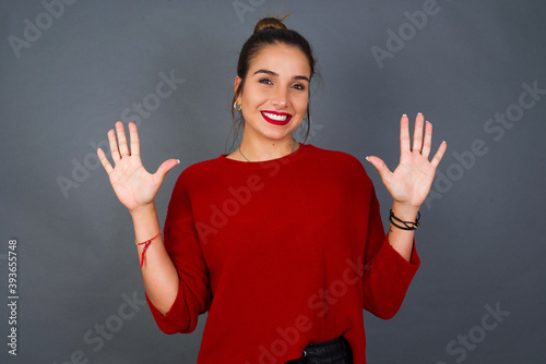 Young beautiful hispanic woman wearing red sweater against gray background showing and pointing up with fingers number ten while smiling confident and happy.