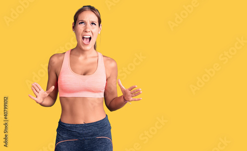 Young beautiful hispanic woman wearing sportswear crazy and mad shouting and yelling with aggressive expression and arms raised. frustration concept.