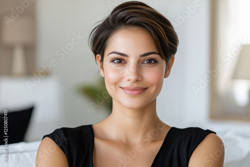 young beautiful indian short hair woman wearing black dress standing at modern living room