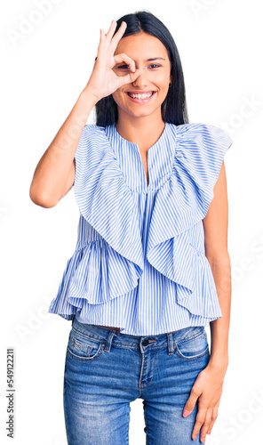 Young beautiful latin girl wearing casual clothes doing ok gesture with hand smiling, eye looking through fingers with happy face.