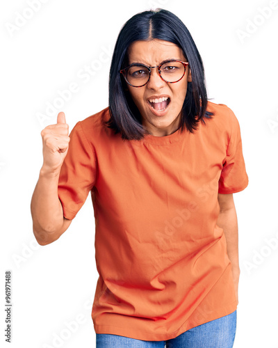 Young beautiful latin woman wearing casual clothes angry and mad raising fist frustrated and furious while shouting with anger. rage and aggressive concept.