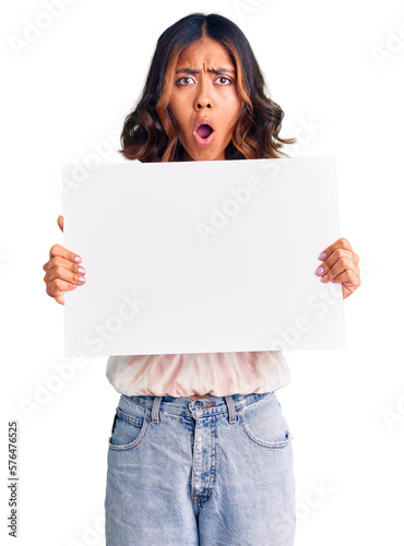Young beautiful mixed race woman holding cardboard banner with blank space scared and amazed with open mouth for surprise, disbelief face