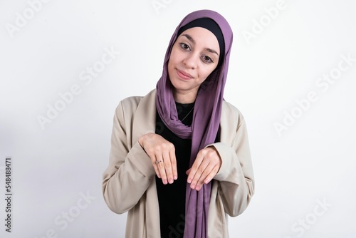 young beautiful muslim woman wearing hijab and jacket over white background makes bunny paws and looks with innocent expression plays with her little kid