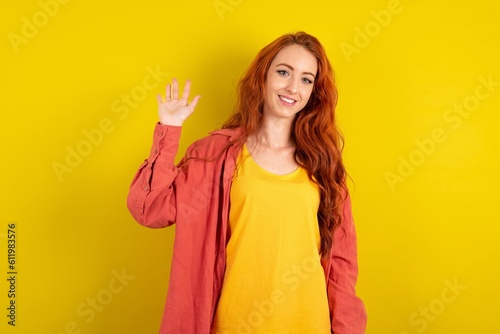 young beautiful red haired woman over yellow studio background Waiving saying hello happy and smiling, friendly welcome gesture.