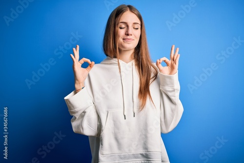 Young beautiful redhead sporty woman wearing sweatshirt over isolated blue background relax and smiling with eyes closed doing meditation gesture with fingers. Yoga concept.