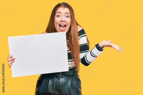Young beautiful redhead woman holding blank empty banner celebrating victory with happy smile and winner expression with raised hands